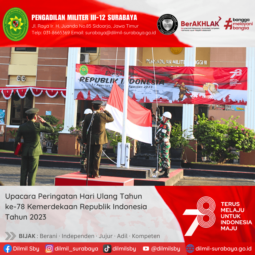 Seluruh anggota Pengadilan Militer Tinggi III Surabaya, Pengadilan Militer III-12 Surabaya, dan Pengadilan Tata Usaha Negara Surabaya melaksanakan Upacara Bendera Memperingati Hari Ulang Tahun Kemerdekaan Republik Indonesia ke-78. Bertindak sebagai Inspektur Upacara adalah Kadilmilti III Surabaya Brigadir Jenderal TNI Kirto, S.H., M.H.