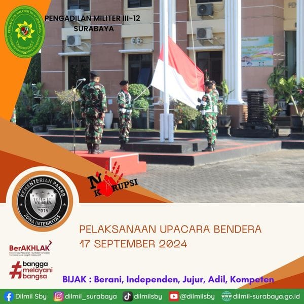 Seluruh personel Pengadilan Militer III-12 Surabaya dan Pengadilan Militer Tinggi III Surabaya mengikuti Upacara Bendera tanggal 17 September 2024. Kegiatan ini dilaksanakan di Lapangan Pengadilan Militer Tinggi III Surabaya. Bertindak sebagai Inspektur Upacara adalah Hakim Militer Tinggi Pengadilan Militer Tinggi III Surabaya Kolonel Chk Sahrul, S.H., M.H.